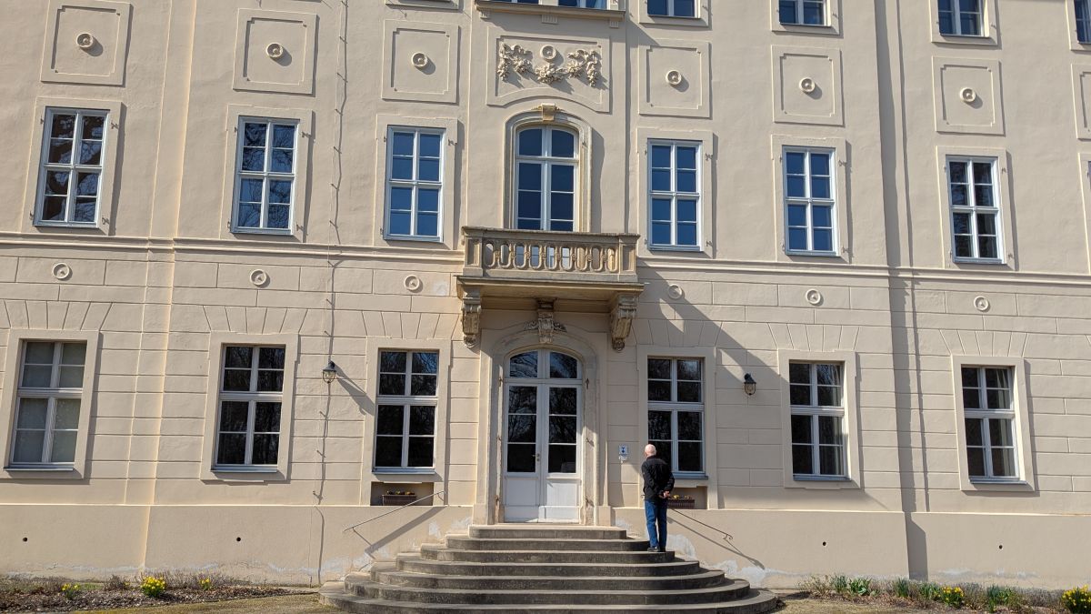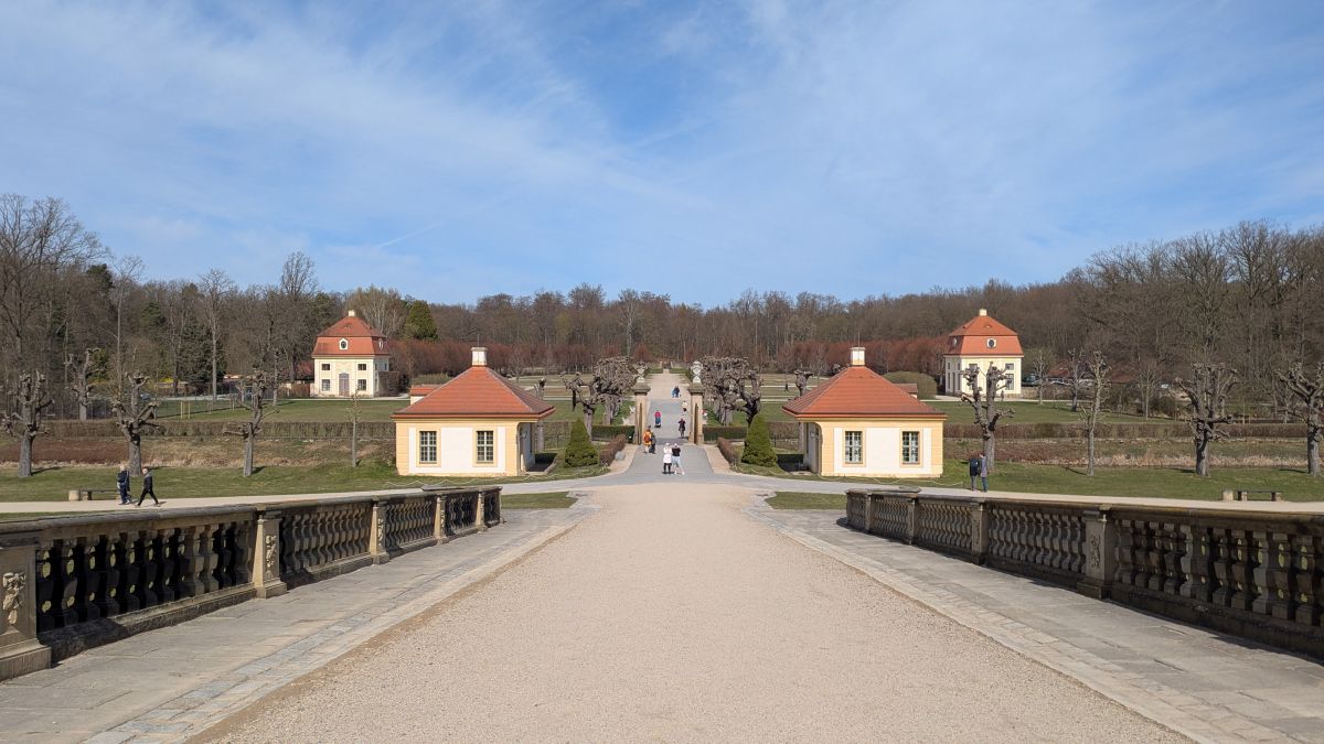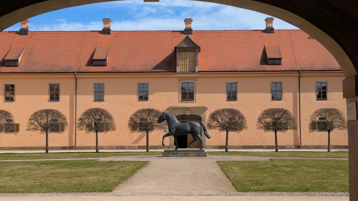 SchlossaufgangBlick zu den Kavaliershäusernder SchuhTeichhäuserSchlossterrasseRast Blick zurück Hengst Elton v. Eros im Landgestüt Moritzburg Schloss LauterbachSchloss Lauterbachalte Postmeilensäule
