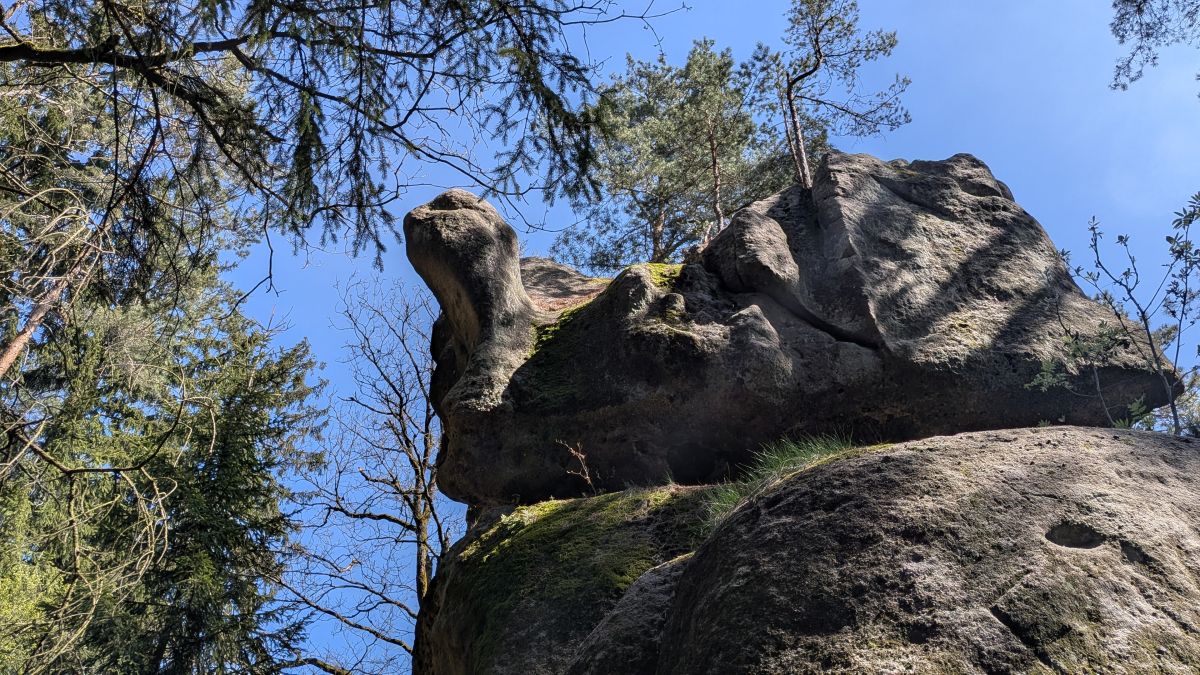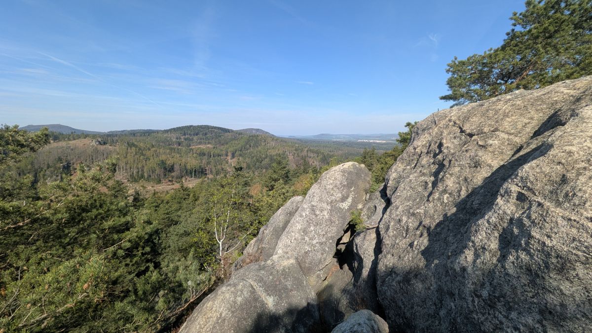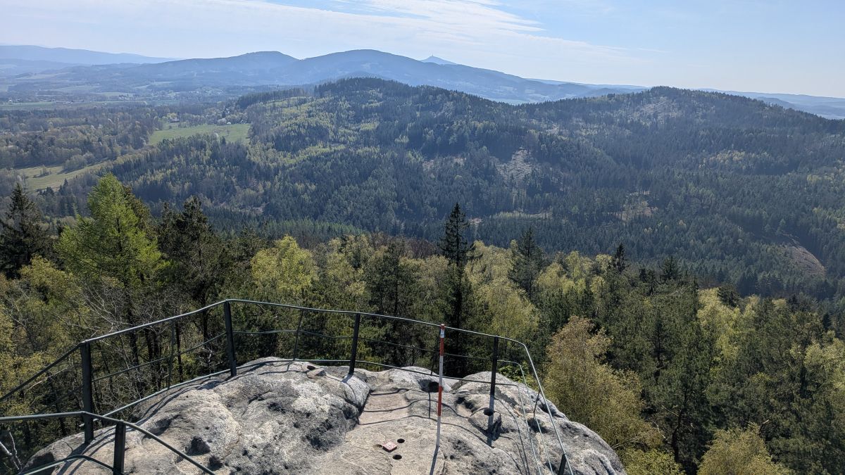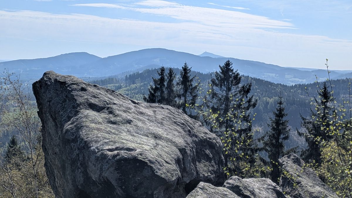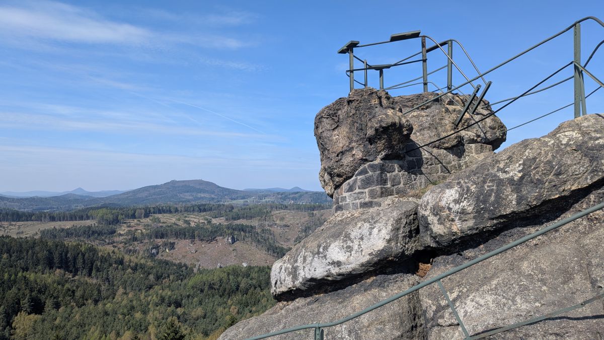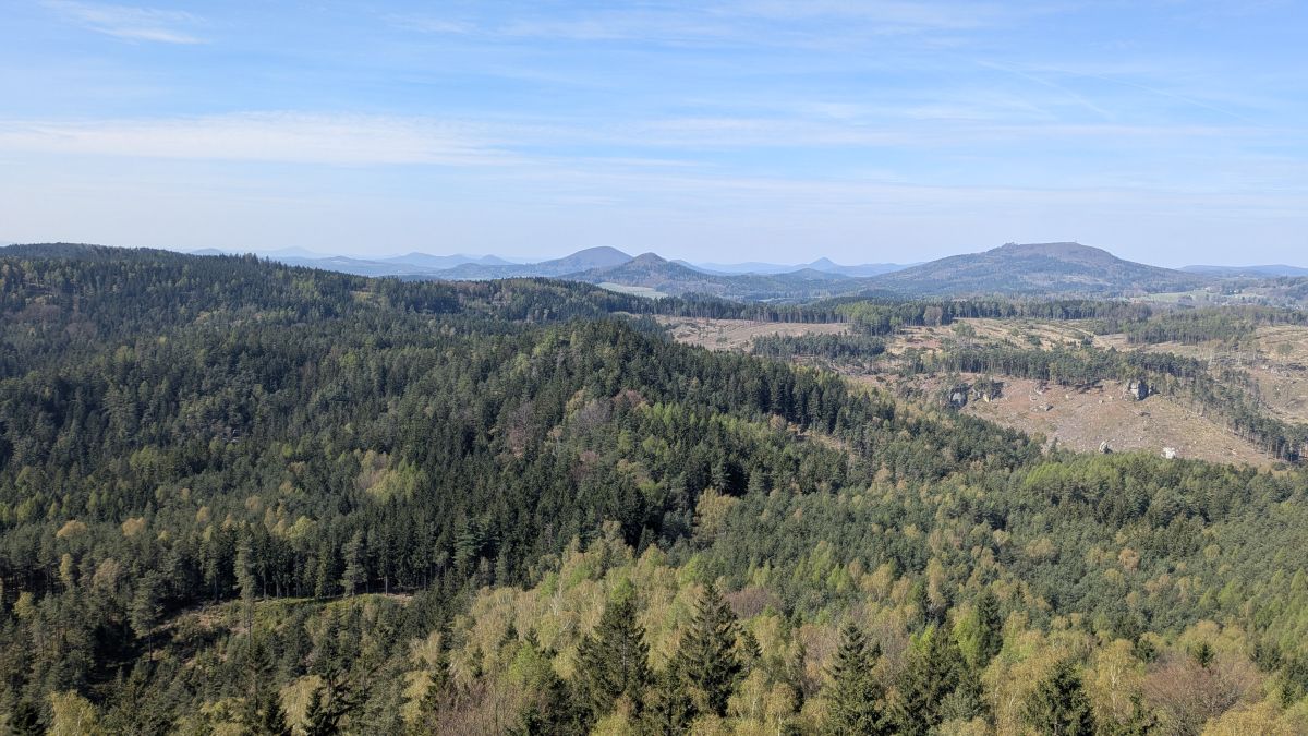 Heute wandere ich auf altbekannten Pfaden. Als ich noch in Zittau arbeitete und die Grenze durchlässig wurde, waren die Berge, die sich dem Zittauer Gebirge anschlossen, plötzlich legal besuchbar. Der Pfaffenstein (Popova skála) war dabei einer der ersten Felsen, der dank eines neuen Grenzübergangs für Fußgänger und Radfahrer in Hartau gut erreichbar war. Damals wurde sogar noch kontrolliert und es gab einen Kiosk, wo man tschechische Kronen tauschen konnte. Der Pfaffenstein hat mich wegen seiner fantastischen Aussicht so fasziniert, dass ich ihm der hier verlinkten Wikipedia-Artikel widmete. Da Hartau ebenso noch keinen Eintrag hatte, lieferte ich diesen gleich mit ab. Heute lief ich einen anderen Weg nach oben, nämlich den kürzeren über den Zigeunerwinkel, wo man ins Böhmische kommt. Für den Aufstieg zum Spitzberg (Sedlecký Špičák) wählte ich einen nicht markierten Weg, der mich an einer mir bis dahin unbekannten Aussicht vorbei führte. Am Pfaffenstein war viel Betrieb, eine Schulklasse (?) rastete lautstark an Fuße. Die Aussicht war heute so mittel, die Schneekoppe versteckte sich im Dunst. Die Kegelberge des Lausitzer Gebirges waren jedoch gut zu sehen. Danach stieg ich über die Felsen unterhalb des Pfaffensteins, in denen ich noch zwei Boofen (deren tschechische Entsprechung ich nicht kenne) entdeckte, bis zum Böhmischen Tor im Weißbachtal ab. Durch das entwaldete Weißbachtal ging es zurück zum Ausgangspunkt.