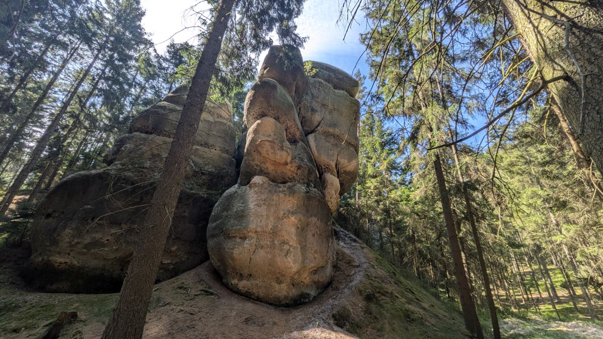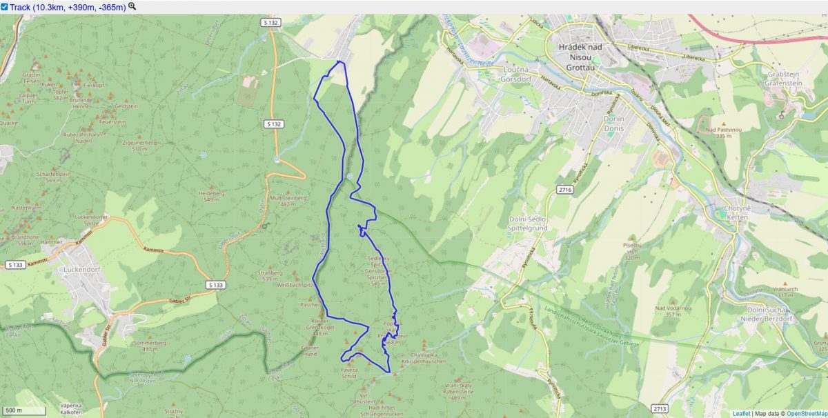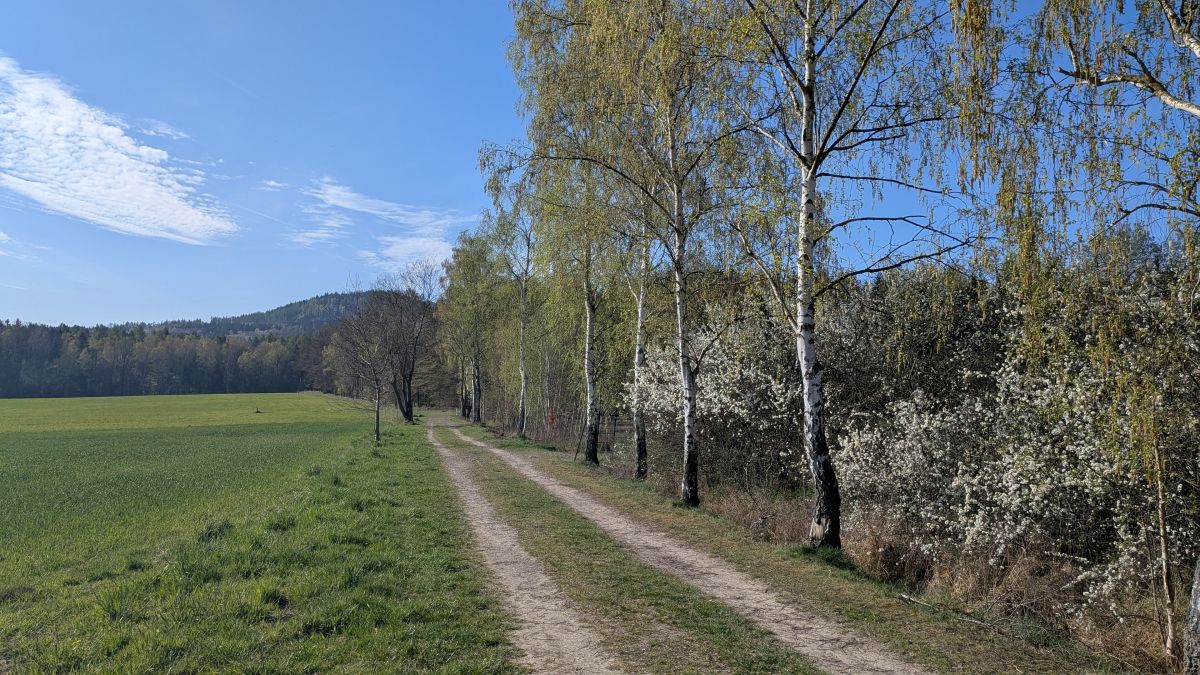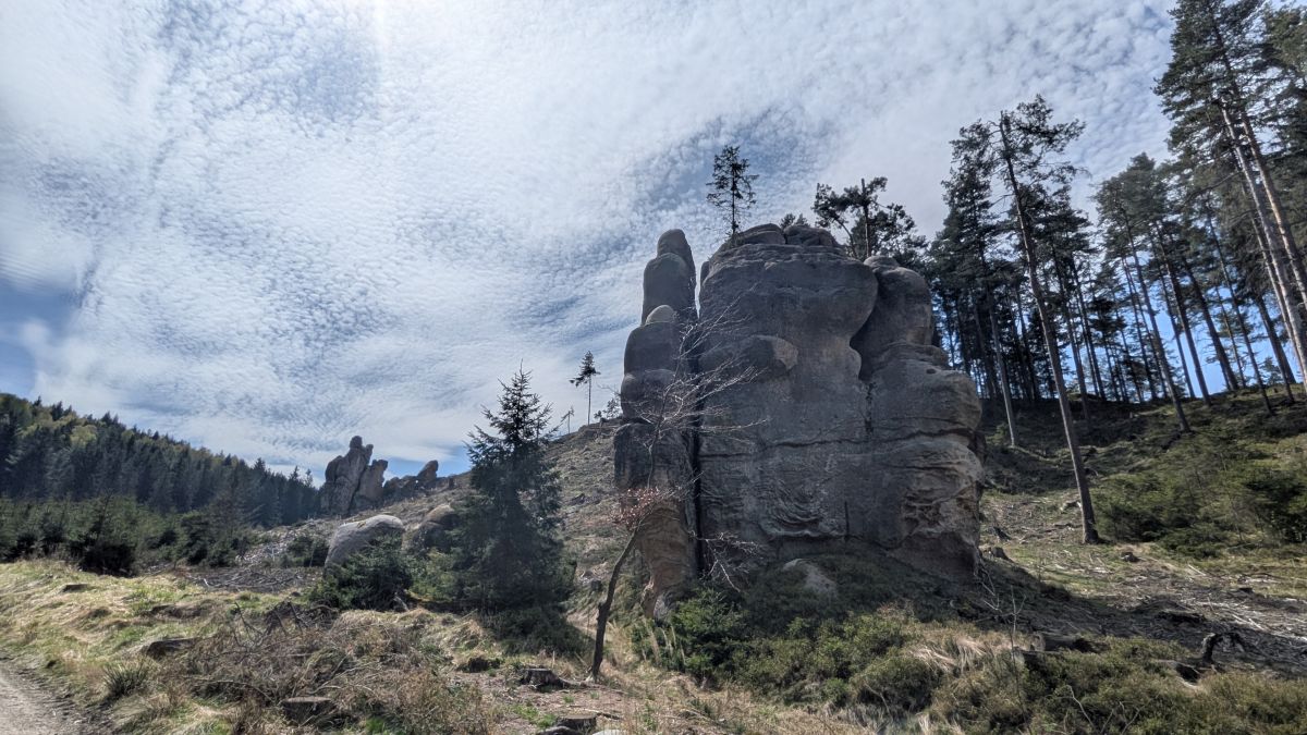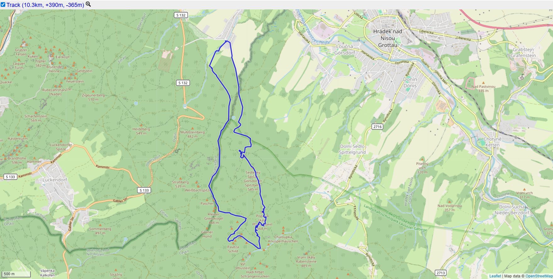 Heute wandere ich auf altbekannten Pfaden. Als ich noch in Zittau arbeitete und die Grenze durchlässig wurde, waren die Berge, die sich dem Zittauer Gebirge anschlossen, plötzlich legal besuchbar. Der Pfaffenstein (Popova skála) war dabei einer der ersten Felsen, der dank eines neuen Grenzübergangs für Fußgänger und Radfahrer in Hartau gut erreichbar war. Damals wurde sogar noch kontrolliert und es gab einen Kiosk, wo man tschechische Kronen tauschen konnte. Der Pfaffenstein hat mich wegen seiner fantastischen Aussicht so fasziniert, dass ich ihm der hier verlinkten Wikipedia-Artikel widmete. Da Hartau ebenso noch keinen Eintrag hatte, lieferte ich diesen gleich mit ab. Heute lief ich einen anderen Weg nach oben, nämlich den kürzeren über den Zigeunerwinkel, wo man ins Böhmische kommt. Für den Aufstieg zum Spitzberg (Sedlecký Špičák) wählte ich einen nicht markierten Weg, der mich an einer mir bis dahin unbekannten Aussicht vorbei führte. Am Pfaffenstein war viel Betrieb, eine Schulklasse (?) rastete lautstark an Fuße. Die Aussicht war heute so mittel, die Schneekoppe versteckte sich im Dunst. Die Kegelberge des Lausitzer Gebirges waren jedoch gut zu sehen. Danach stieg ich über die Felsen unterhalb des Pfaffensteins, in denen ich noch zwei Boofen (deren tschechische Entsprechung ich nicht kenne) entdeckte, bis zum Böhmischen Tor im Weißbachtal ab. Durch das entwaldete Weißbachtal ging es zurück zum Ausgangspunkt.