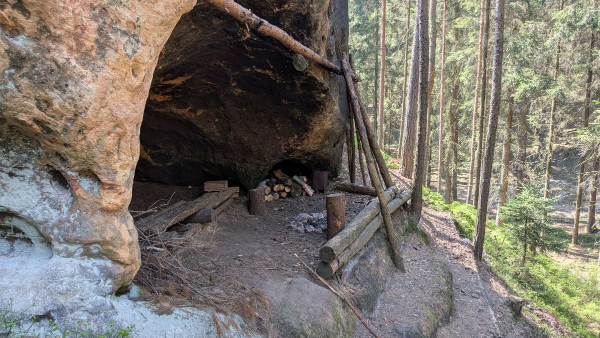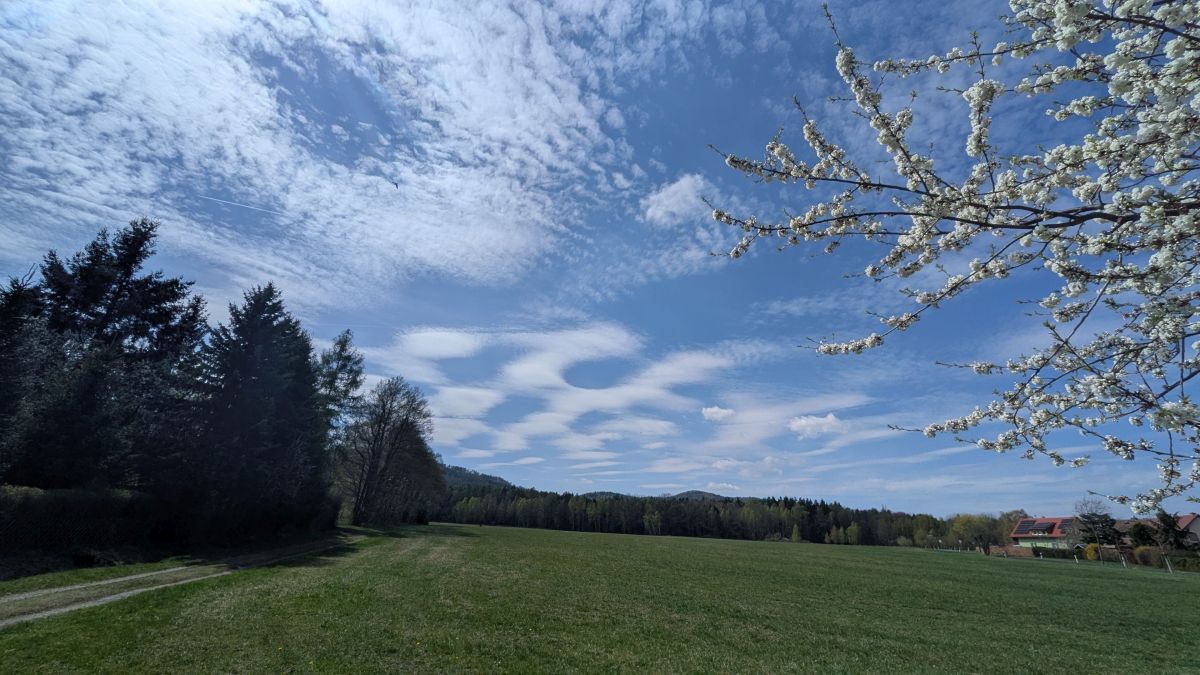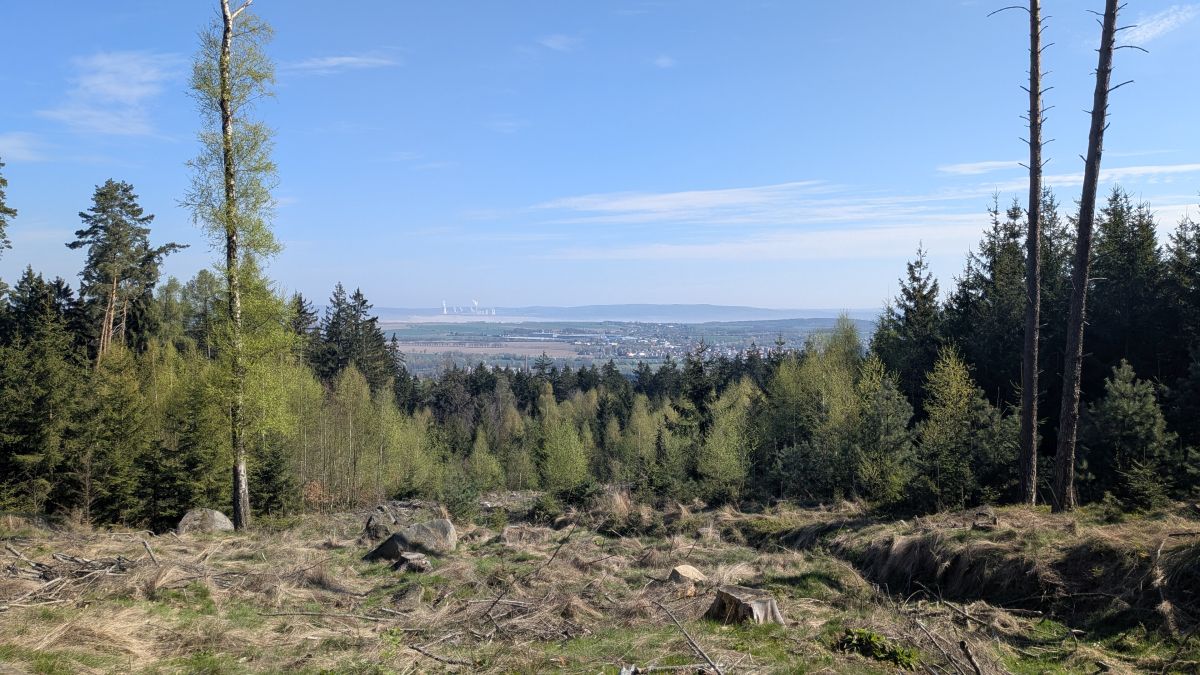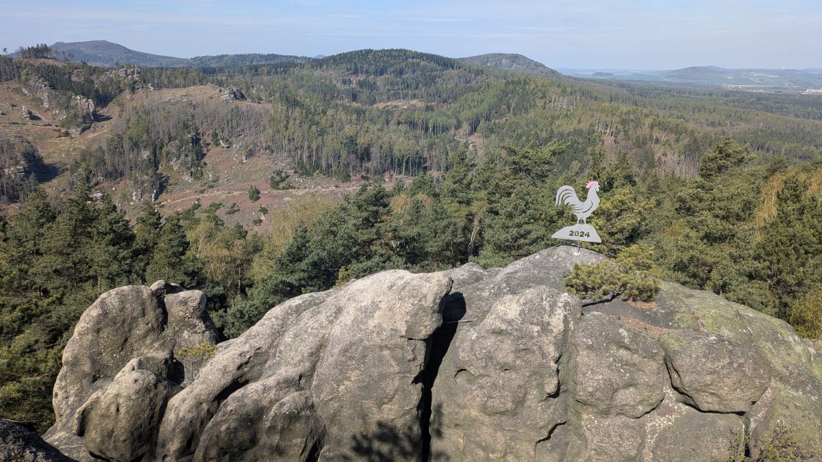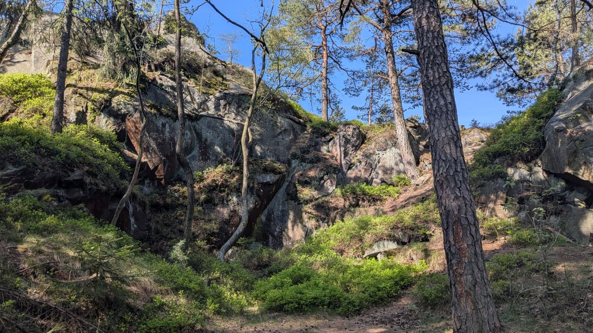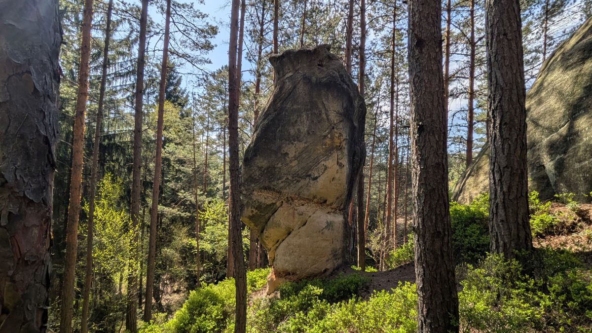 Heute wandere ich auf altbekannten Pfaden. Als ich noch in Zittau arbeitete und die Grenze durchlässig wurde, waren die Berge, die sich dem Zittauer Gebirge anschlossen, plötzlich legal besuchbar. Der Pfaffenstein (Popova skála) war dabei einer der ersten Felsen, der dank eines neuen Grenzübergangs für Fußgänger und Radfahrer in Hartau gut erreichbar war. Damals wurde sogar noch kontrolliert und es gab einen Kiosk, wo man tschechische Kronen tauschen konnte. Der Pfaffenstein hat mich wegen seiner fantastischen Aussicht so fasziniert, dass ich ihm der hier verlinkten Wikipedia-Artikel widmete. Da Hartau ebenso noch keinen Eintrag hatte, lieferte ich diesen gleich mit ab. Heute lief ich einen anderen Weg nach oben, nämlich den kürzeren über den Zigeunerwinkel, wo man ins Böhmische kommt. Für den Aufstieg zum Spitzberg (Sedlecký Špičák) wählte ich einen nicht markierten Weg, der mich an einer mir bis dahin unbekannten Aussicht vorbei führte. Am Pfaffenstein war viel Betrieb, eine Schulklasse (?) rastete lautstark an Fuße. Die Aussicht war heute so mittel, die Schneekoppe versteckte sich im Dunst. Die Kegelberge des Lausitzer Gebirges waren jedoch gut zu sehen. Danach stieg ich über die Felsen unterhalb des Pfaffensteins, in denen ich noch zwei Boofen (deren tschechische Entsprechung ich nicht kenne) entdeckte, bis zum Böhmischen Tor im Weißbachtal ab. Durch das entwaldete Weißbachtal ging es zurück zum Ausgangspunkt.