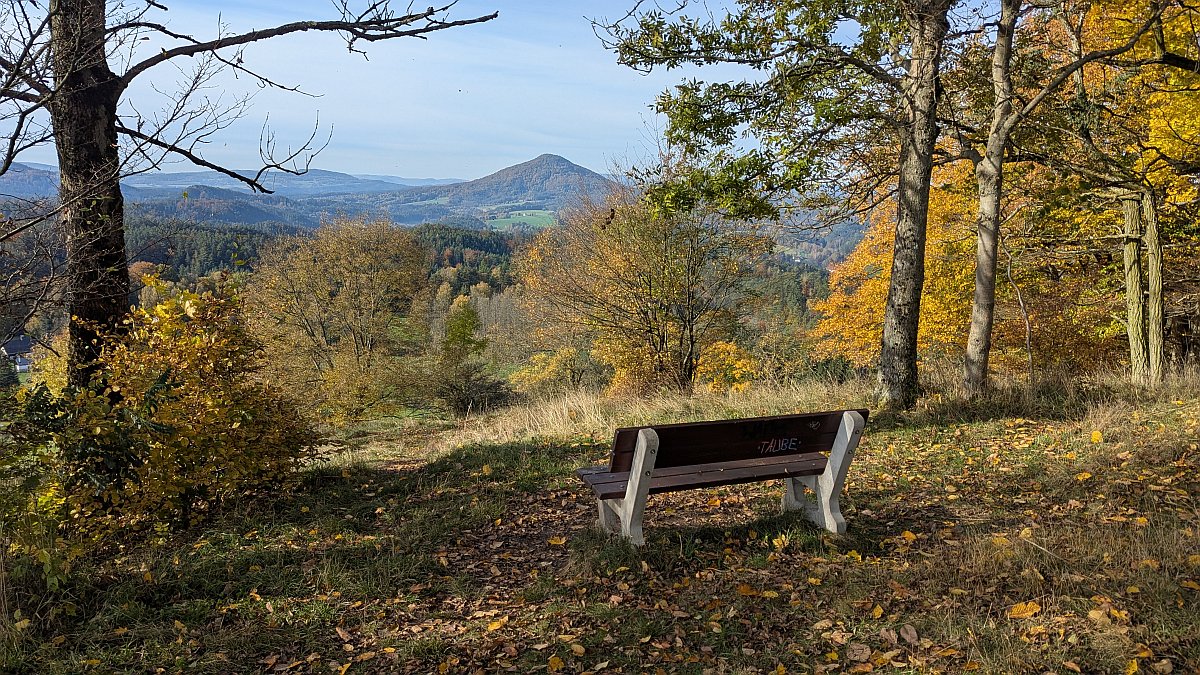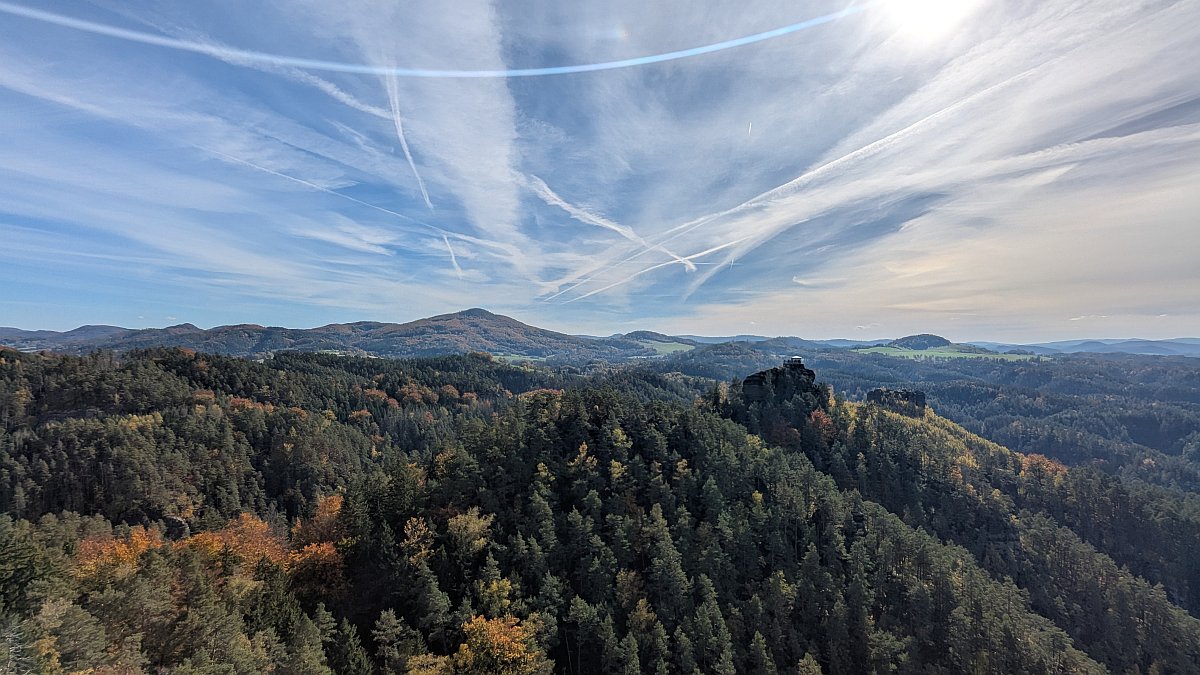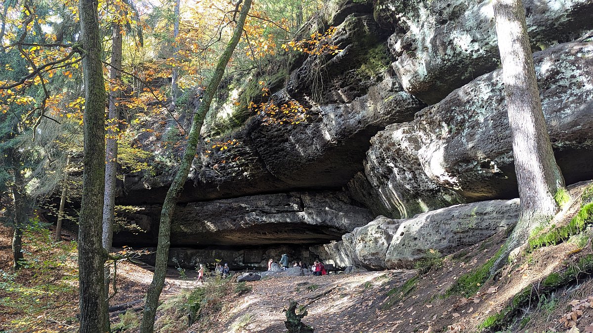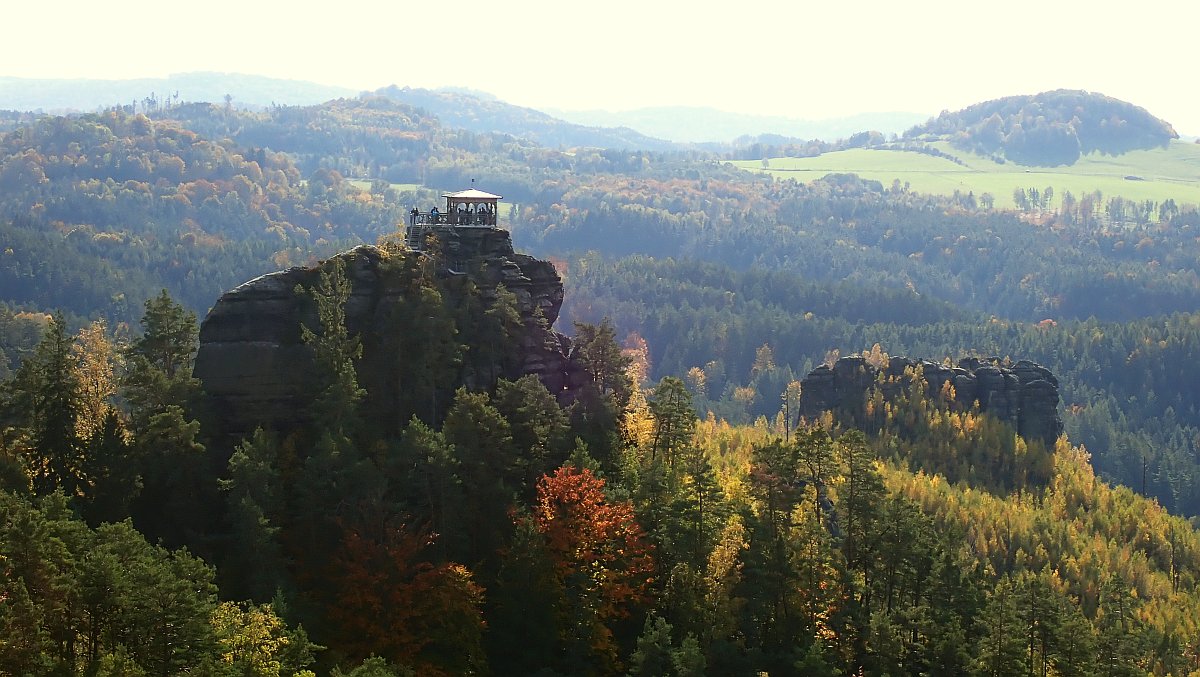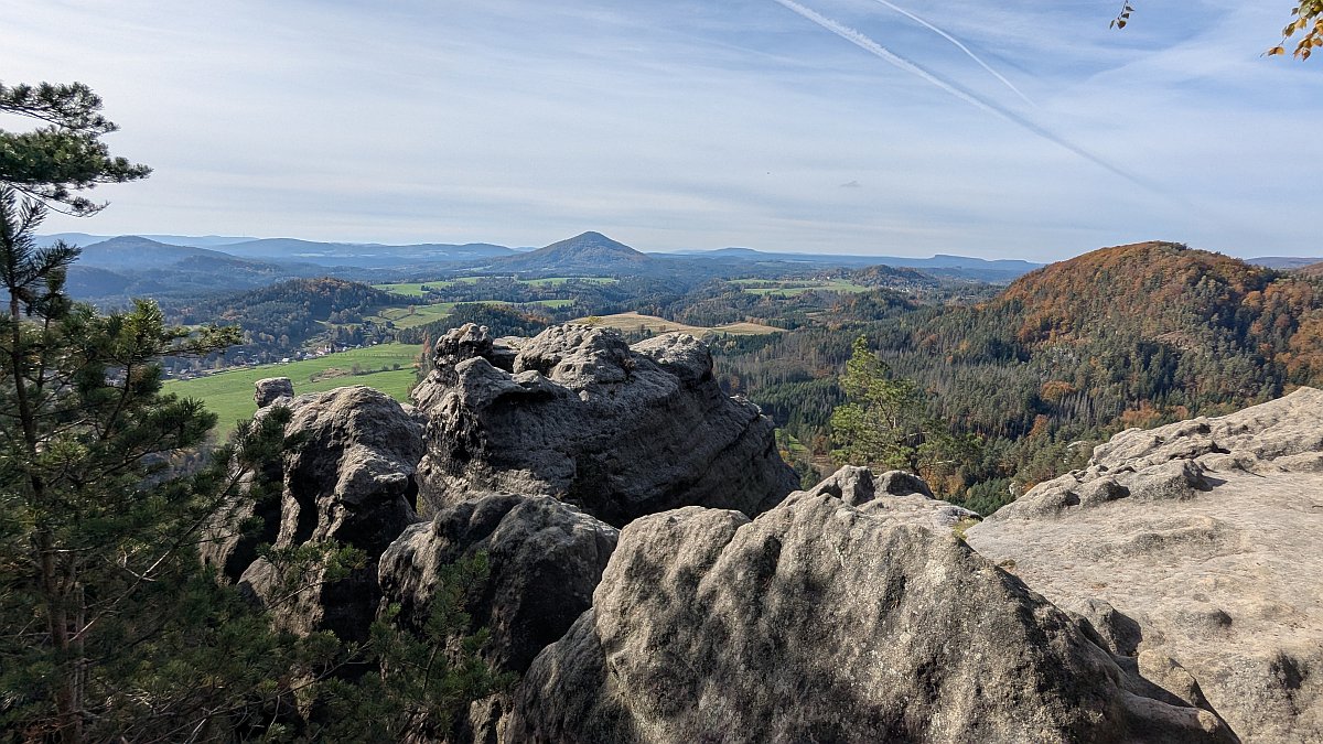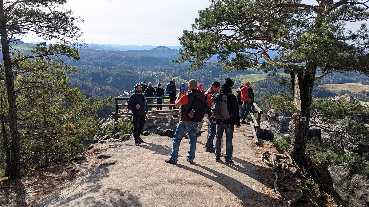 Nach einer frostigen Nacht fahre ich heute nach Dittersbach (Jetřichovice), um den Goldenen Oktober zu genießen. Zunächst laufe ich über die Steinerne Rinne nach Rennersdorf (Rynartice). Hier steige ich zum Kreuzberg (Křížový vrch) auf, der heute eine fantastische Aussicht bietet. An der Wilheminienwand (Vilemínina stěna) treffe ich auf viele, vor allem deutsche Wanderer. Deshalb lasse ich beim Rückweg nach Dittersbach den Aufstieg zum Marienfelsen (Mariina skála) aus.