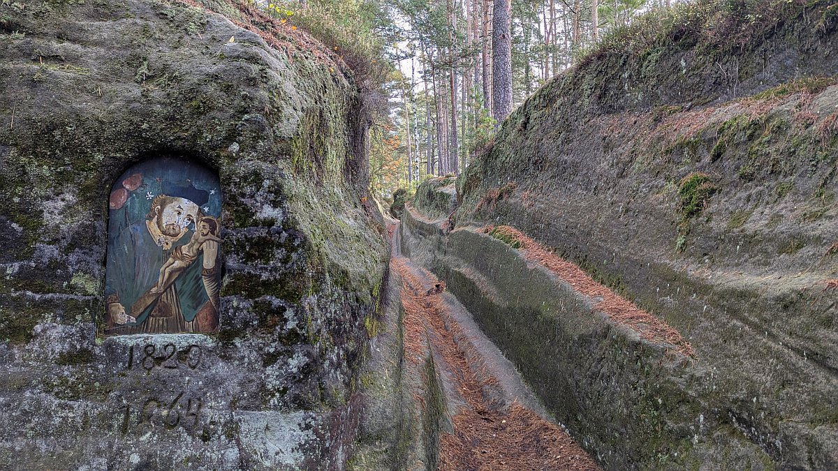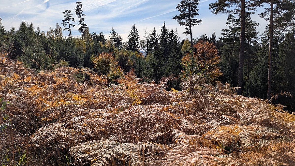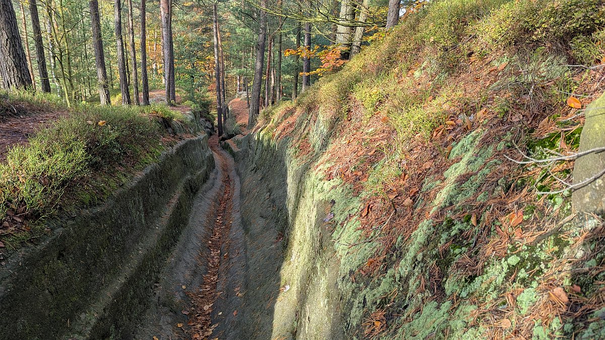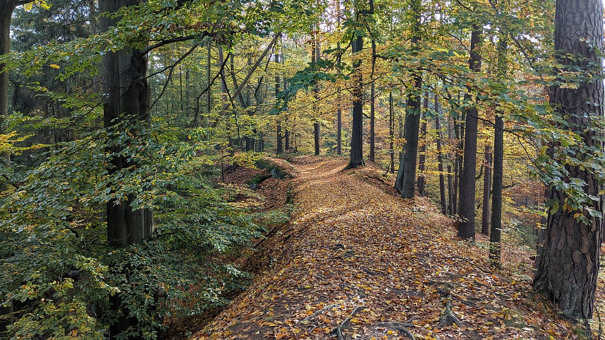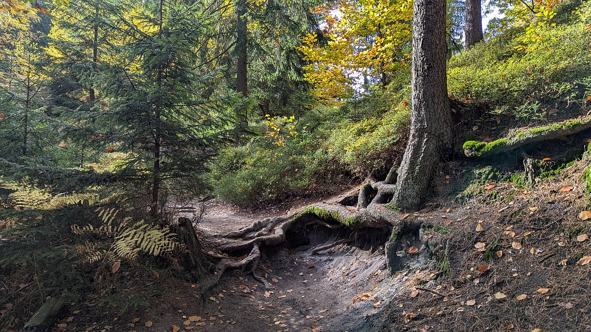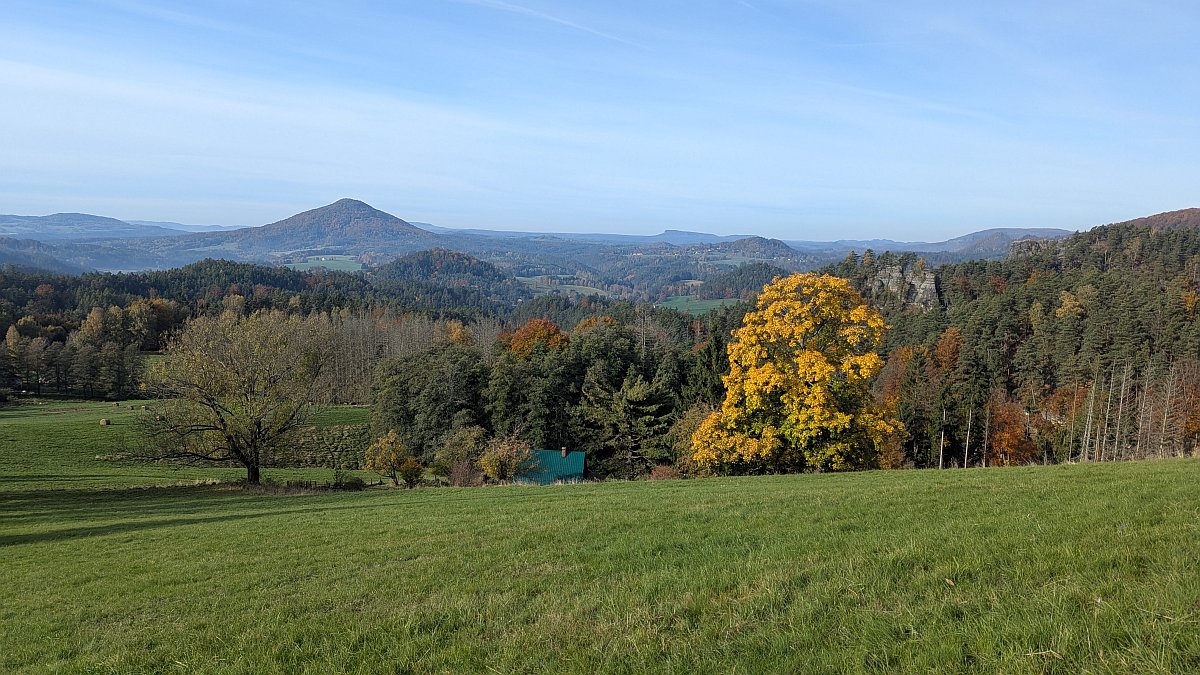 Nach einer frostigen Nacht fahre ich heute nach Dittersbach (Jetřichovice), um den Goldenen Oktober zu genießen. Zunächst laufe ich über die Steinerne Rinne nach Rennersdorf (Rynartice). Hier steige ich zum Kreuzberg (Křížový vrch) auf, der heute eine fantastische Aussicht bietet. An der Wilheminienwand (Vilemínina stěna) treffe ich auf viele, vor allem deutsche Wanderer. Deshalb lasse ich beim Rückweg nach Dittersbach den Aufstieg zum Marienfelsen (Mariina skála) aus.