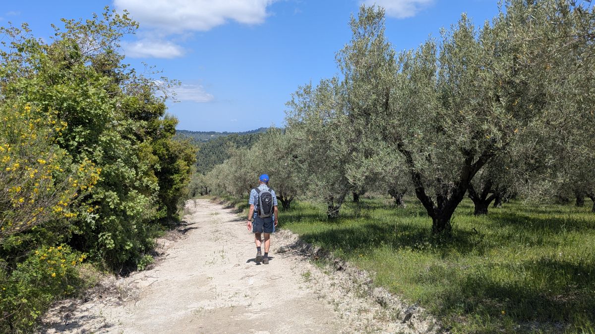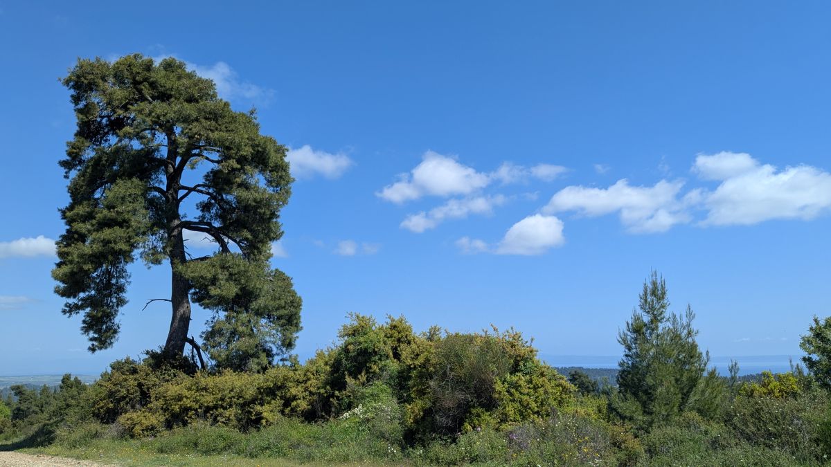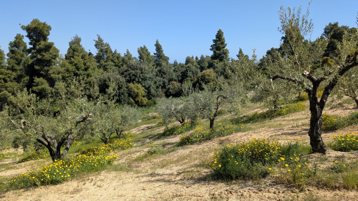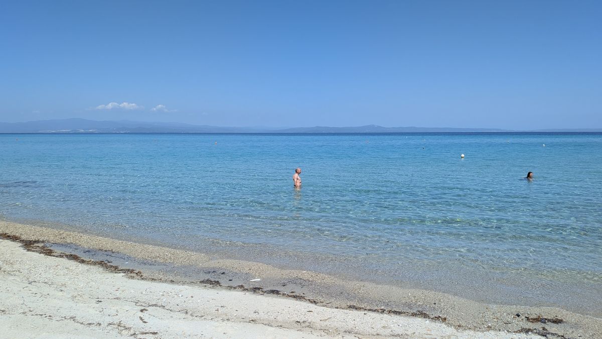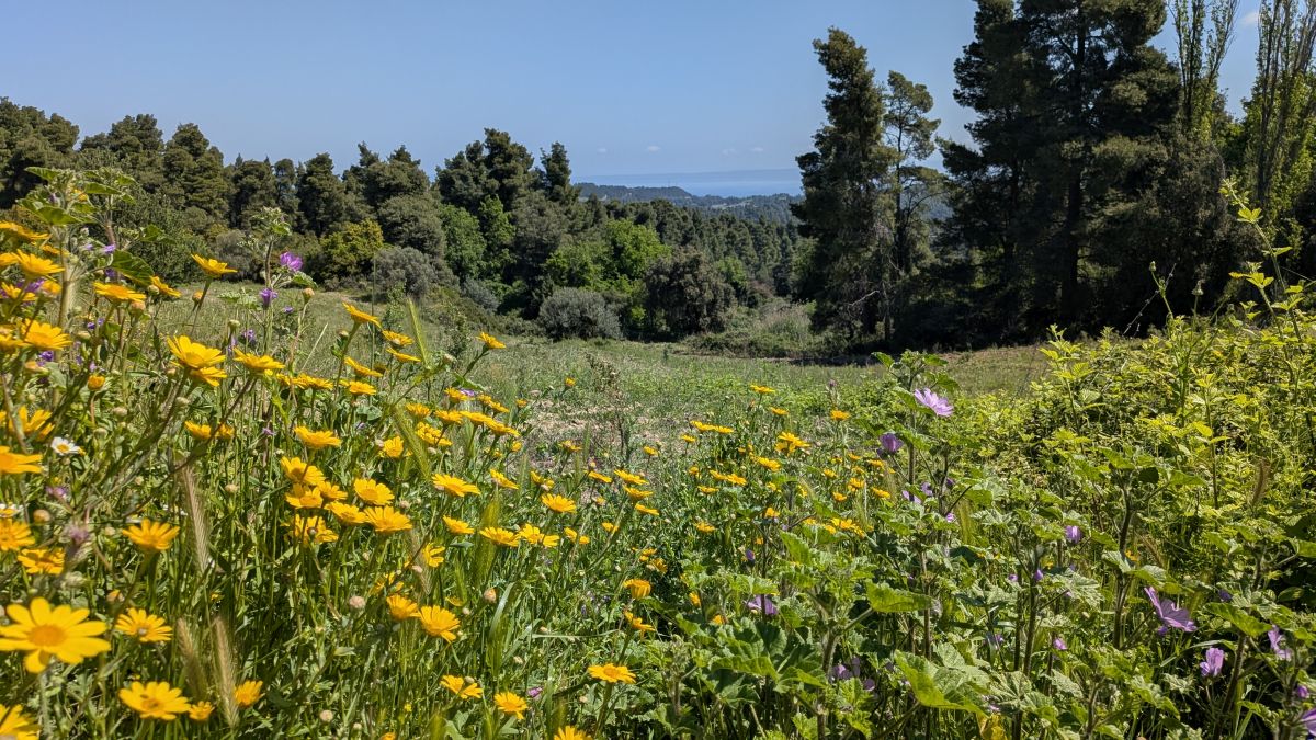 Heute fahren wir ins Dorf Kassandrino, wo wir eine Wanderung durch die Hügel starten. Zunächst trinken wir einen griechischen Kaffee im Dorf-Kaffenion. Rudi macht danach eine kleine Wanderung um das Dorf, wir eine Größere, die hinauf auf die Hügel führt. Hier haben wir Aussichten auf beide Meeresseiten, bis hin zum schneebedeckten Olymp. Die Fotos davon sind auf Grund der Entfernung aber eher unspektakulär. Wunderschön sind wieder die üppig blühenden Wiesen. Zurück in Afytos wagen wir das erste Mal, im Meer schwimmen zu gehen. Das Wasser ist herrlich, kalt und glasklar.